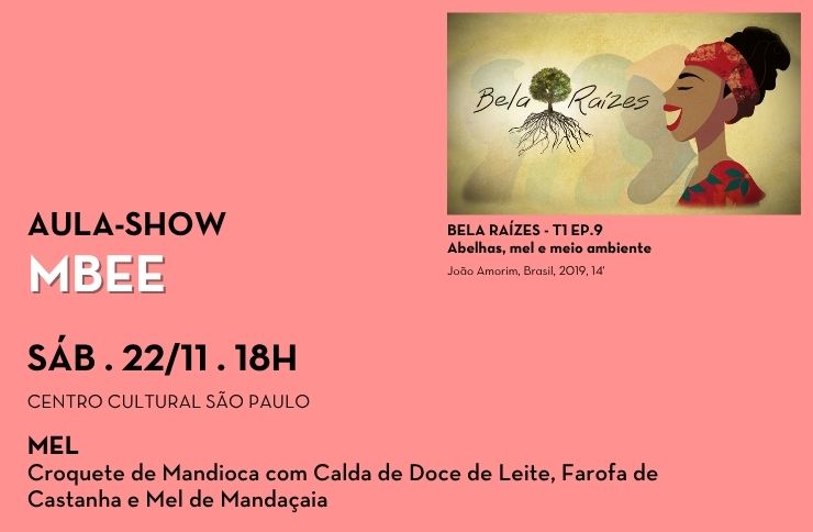 Os fundadores, Eugênio e Márcia, da Mbee, empresa dedicada à apicultura sustentável, conduzem uma demonstração com uma variedade de méles e apresentam uma receita finalizada com mel de abelhas jataí. Mais do que um ingrediente, o mel aparece aqui como metáfora de equilíbrio entre seres vivos e ecossistemas, revelando a doçura que nasce do cuidado com o meio ambiente. A aula acontece após a exibição de Bela Raízes - T1 EP.9 - Abelhas, mel e meio ambiente (Brasil, 2019, 13’). DEGUSTAÇÃO: Croquete de Mandioca com Calda de Doce de Leite, Farofa de Castanha e Mel de Mandaçaia Retire seu ingresso na bilheteria do Centro Cultural São Paulo e realize sua inscrição com os monitores do festival. Serão 100 vagas por aula.
