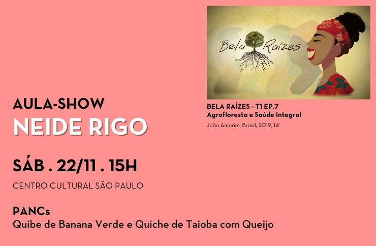 Com a culinarista e pesquisadora Neide Rigo, esta aula-show mergulha nas relações entre sociobiodiversidade e alimentação saudável. A partir das Plantas Alimentícias Não Convencionais (PANCs), Neide propõe um olhar curioso e criativo sobre o que brota ao nosso redor. O público poderá degustar um quibe de banana verde e uma quiche de taioba com queijo, receitas que traduzem a potência nutritiva e cultural da agrofloresta em cada ingrediente. A aula acontece após a exibição de Bela Raízes - T1 EP.7 - Agrofloresta e Saúde Integral (Brasil, 2019, 14’). DEGUSTAÇÃO: Quibe de Banana Verde e Quiche de Taioba com Queijo Retire seu ingresso na bilheteria do Centro Cultural São Paulo e realize sua inscrição com os monitores do festival. Serão 100 vagas por aula.